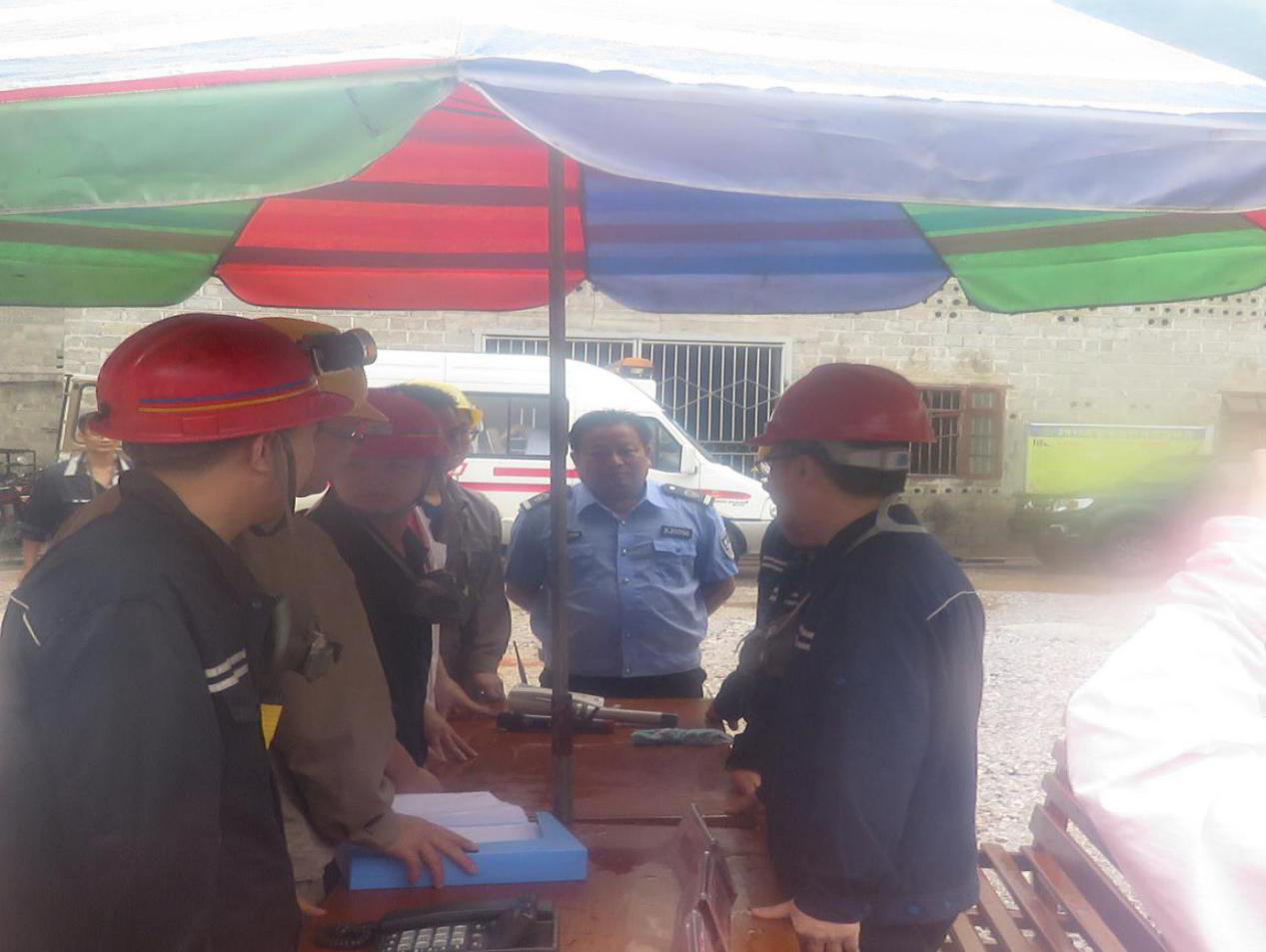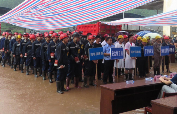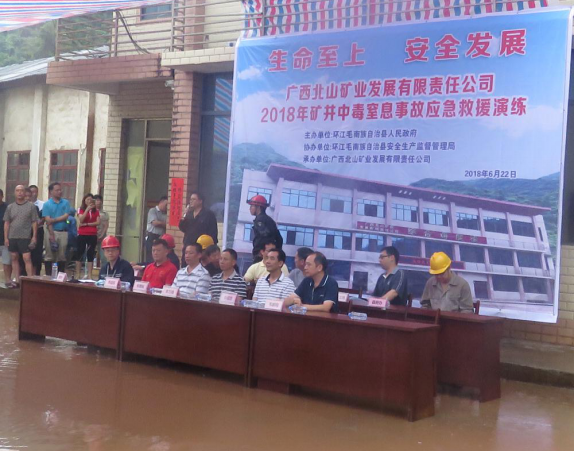 6月22日上午,北山公司在生产区内开展2018年度矿井中毒窒息事故应急救援演练。环江县县委常委(副县长)李万峰、县安监局局长韦雅贴及县应急办、县安监局、县国土局、驯乐乡人民政府、周边矿山企业等单位的领导到现场观摩。