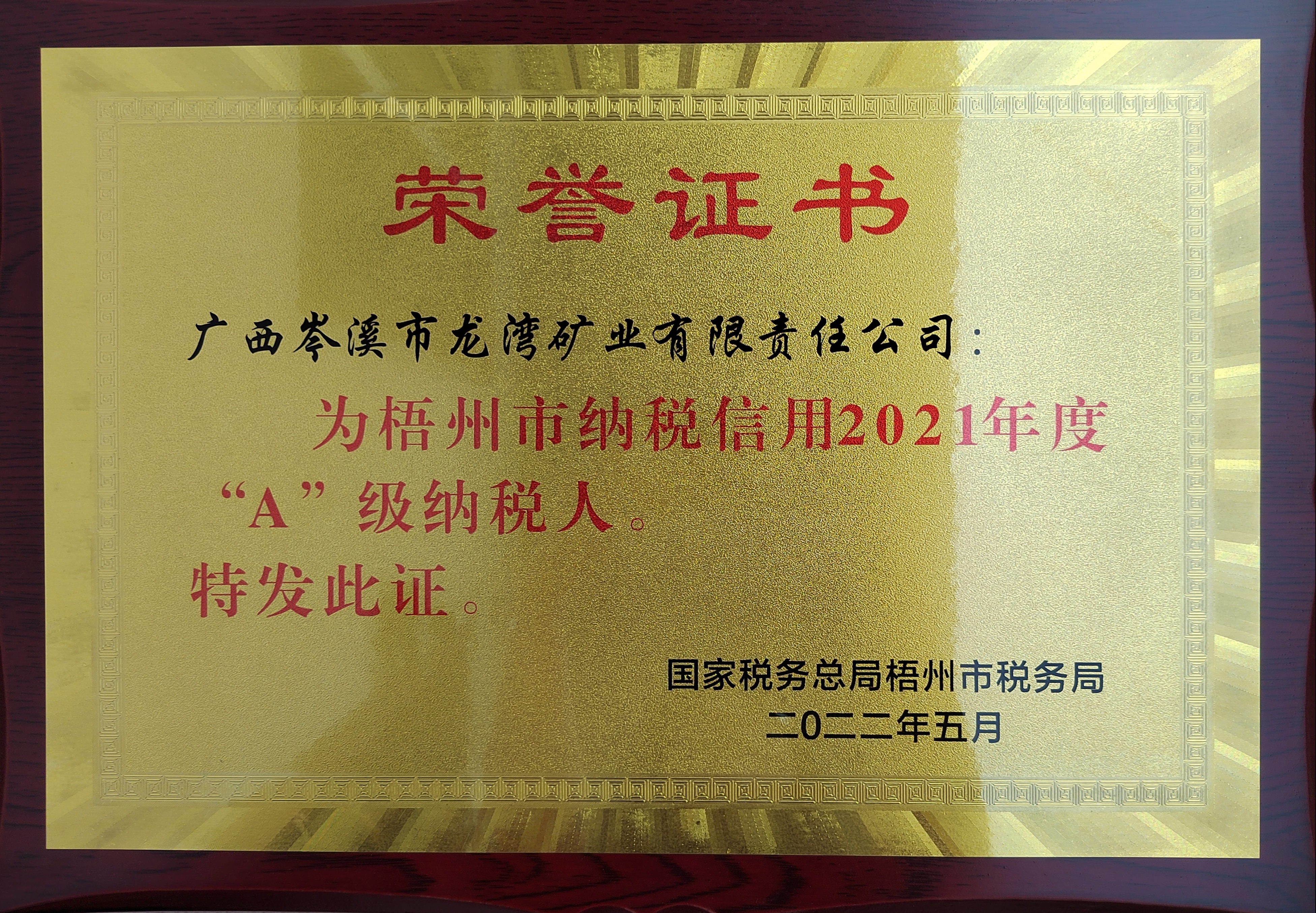 2022年6月2日,国家税务总局岑溪市税务局召开以“税银赋能激活力 以信增贷解难题”为主题的岑溪市纳税人表彰大会,龙湾公司获评为梧州市纳税信用2021年度“A”级纳税人,龙湾公司已连续三年获得该荣誉。龙湾公司副总经理李强代表公司受领了大会颁发的牌匾并代表纳税人作了大会发言。在岑溪市优质的营商环境下,龙湾公司向着把企业做大做强的目标,争取通过两到三年时间的努力奋斗,实现营业收入翻一番,纳税贡献翻一番。