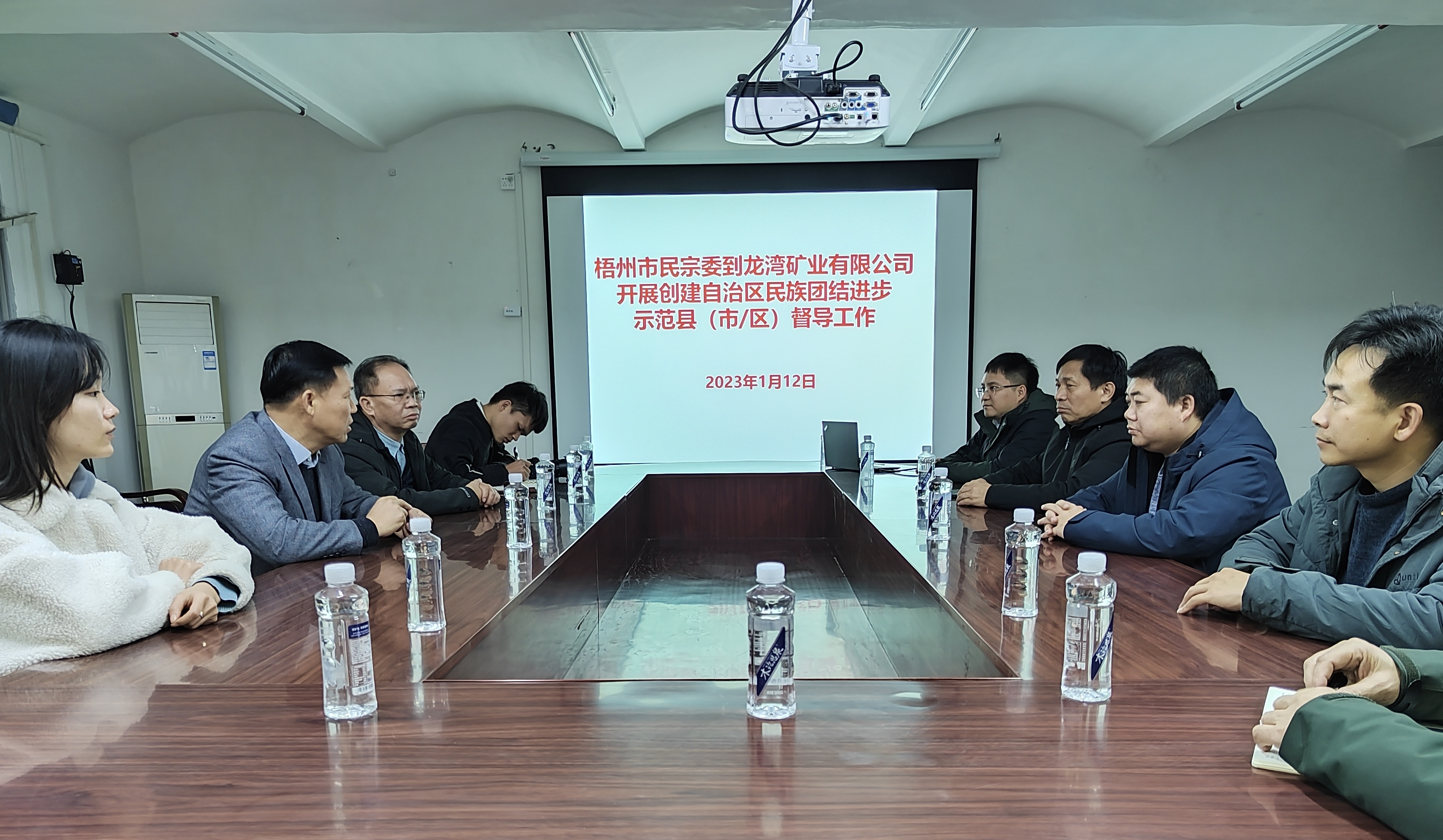 2023年1月12日,梧州市民宗委副主任李联强率队到龙湾公司开展创建自治区民族团结进步示范县(市/区)督导工作。诚谏镇镇长李建勇,龙湾公司副总经理李强、陈传革等陪同督查。