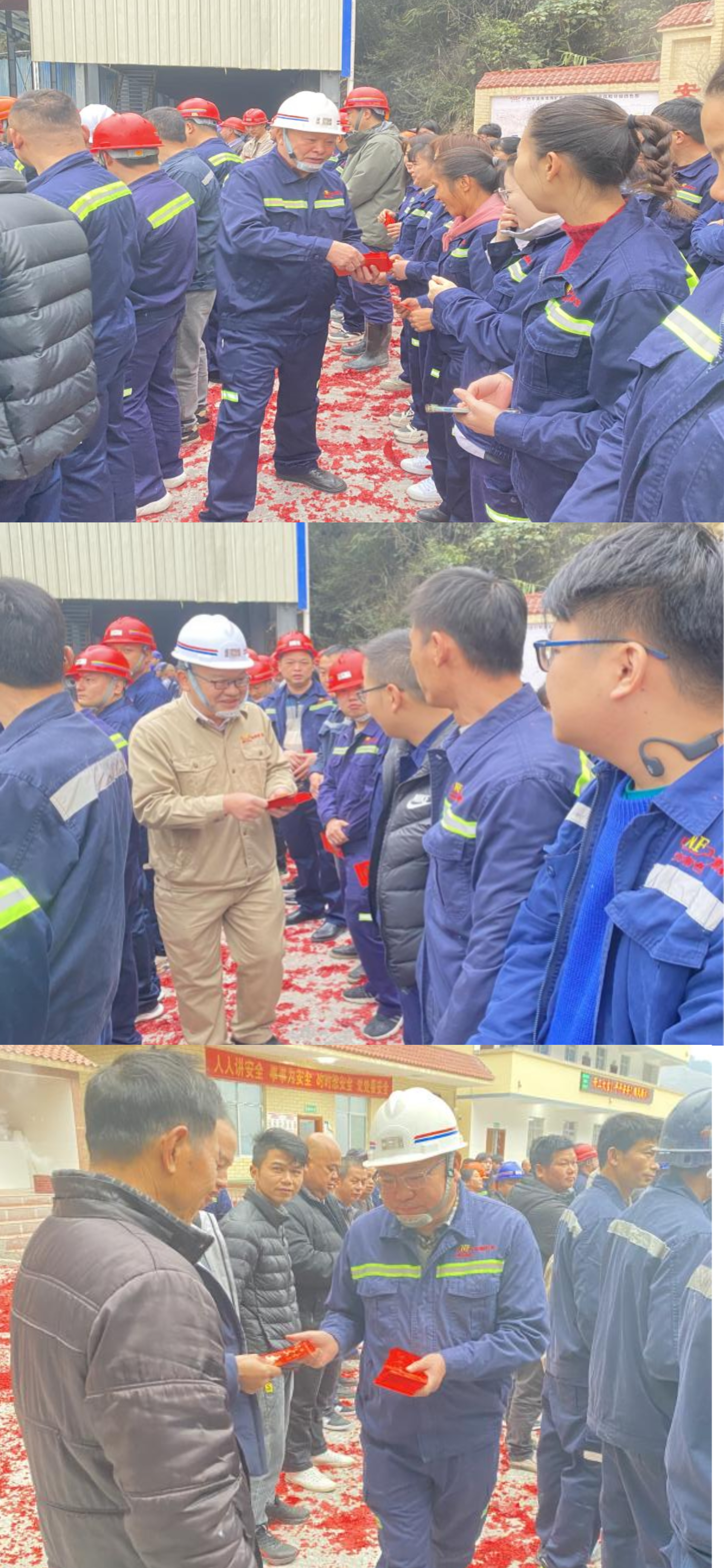8:00,随着漫天鞭炮声响彻晴空,全体员工早早来到公司报到,人人面带笑容,个个信心满满,整个公司沉浸在一片喜气洋洋的祥和氛围。在欢笑声中,金河公司董事长兼龙湾公司董事长杨再春、金河公司常务副总经理吴少华、金河公司总工程师兼龙湾公司总经理肖绍文为职工派发新年开工利市,给员工鼓励,寓意新的一年开工大吉、顺顺利利。