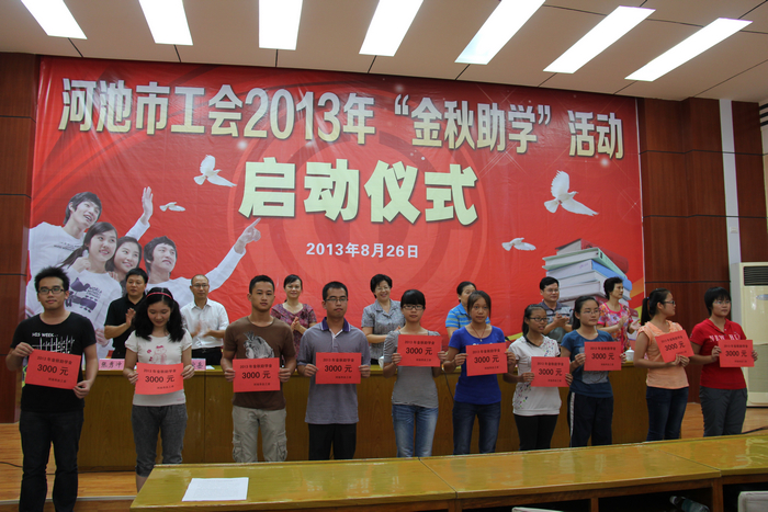 河池讯(通讯员 梁莹)2013年8月26日下午,河池市总工会在行署一楼会议大厅隆重举行2013年“金秋助学”活动启动仪式,市委常委副市长黎丽、市总工会主席吴胜梅等领导出席,金河公司25名受资助的贫困学生和学生家长参加了此次启动仪式。