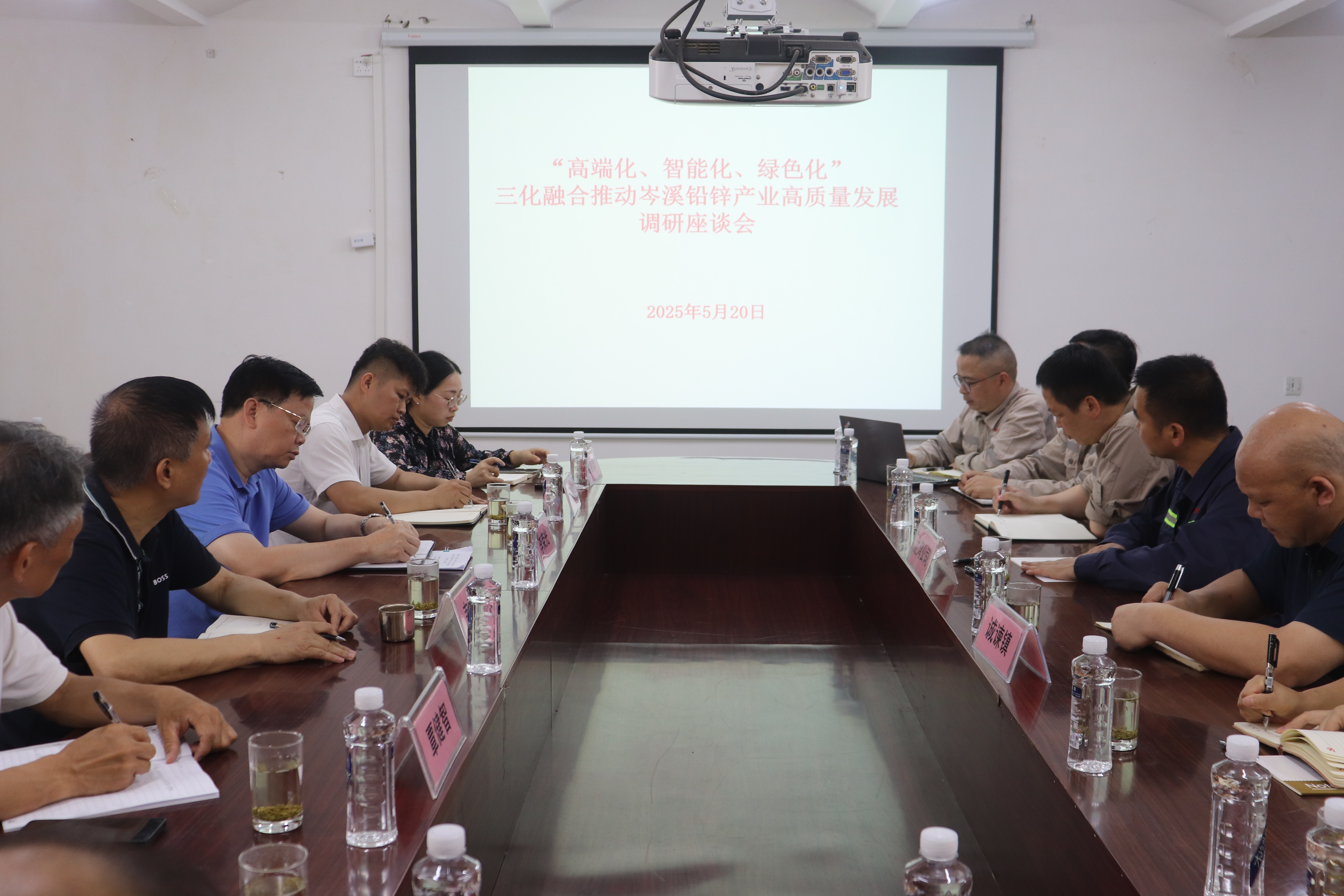 2025年5月20日,岑溪市政协主席、党组书记韦学文到龙湾公司进行“高端化 、智能化 、绿色化”三化融合推动岑溪铅锌产业高质量发展调研,倾听企业发展诉求,助力优化营商环境,助推岑溪市铅锌产业高质量发展。岑溪市政协副主席、党组成员李荣光,市工商业联合会、市科技和工业信息化局、市自然资源局及诚谏镇政府等相关部门领导陪同参加调研。龙湾公司总经理韦优扬、总工程师魏宏焓等领导陪同。