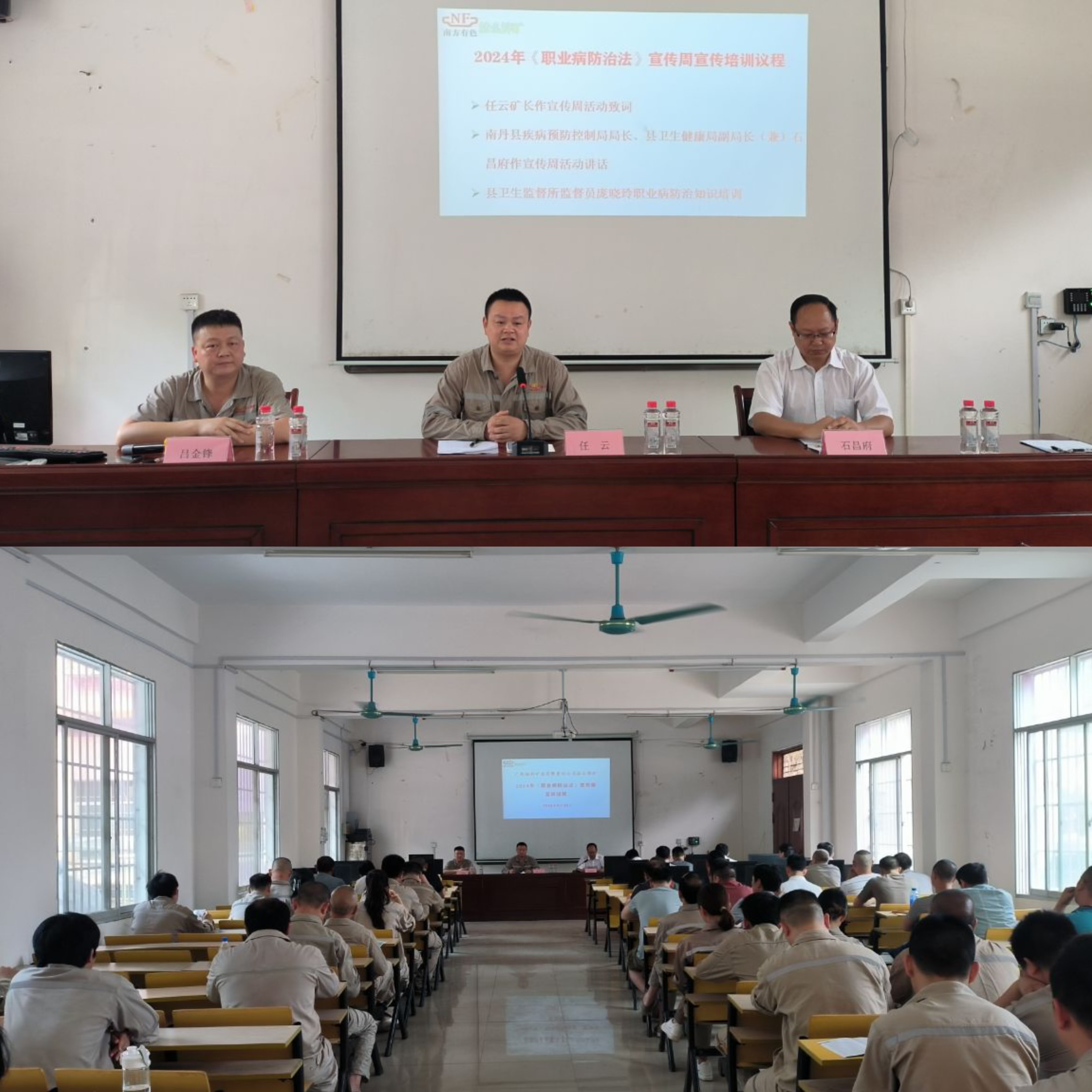 2024年4月29日,南丹县卫生健康局副局长石昌府率疾病预防控制中心专家到拉么锌矿开展宣传周活动宣传,职业卫生专家庞晓玲为全矿员工讲授职业病防治知识。拉么锌矿党委书记、矿长任云,副矿长吕金锋等领导班子参加活动。共有200余人参加培训。